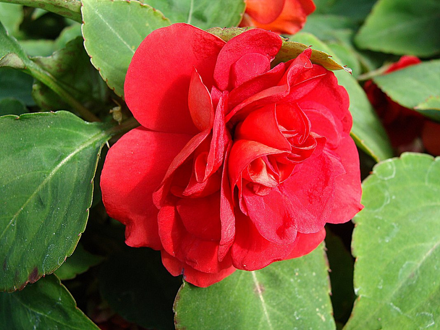 Цветущий бальзамин столь схож с миниатюрной розой, что может стать полноценной ее заменой в цветнике. Помимо садового использования, растение выращивают как комнатный цветок.