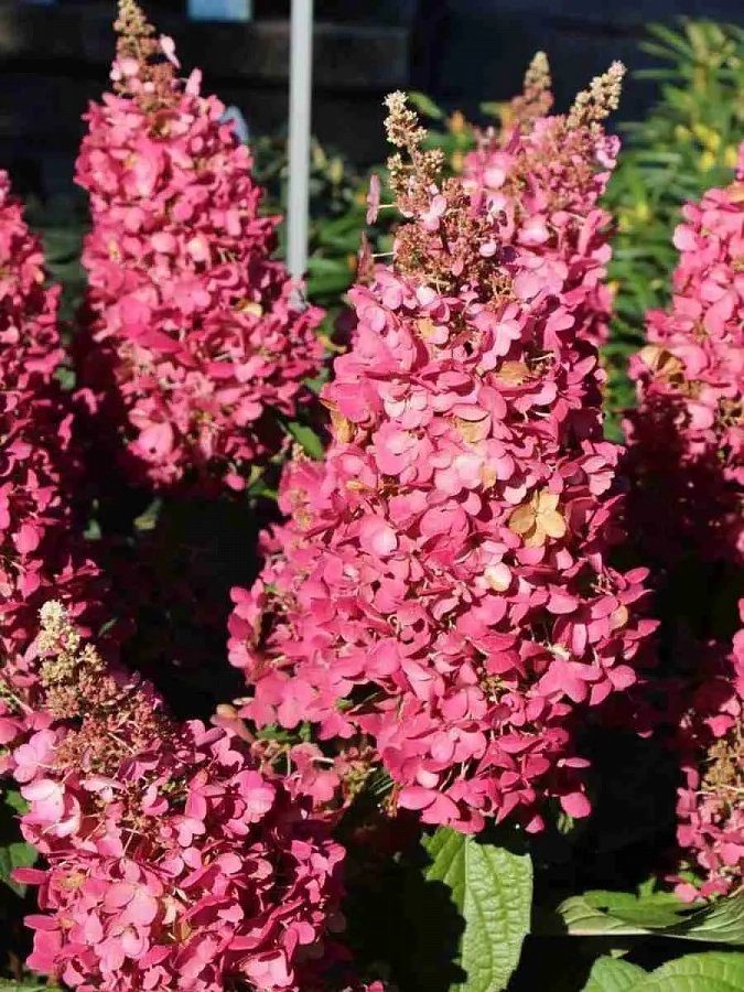 Саженцы гортензии метельчатой Mega Mindy (Мега Минди) отличаются очень быстрым ростом. Кустарник достигает высоты 175 см и начинает обильно цвести с июля по октябрь. Цветы собраны в пышные конические соцветия. Вначале их цвет белый, но позже он становится вишнево-красным или малиновым. Крупномер зимостойкий, но растения молодые требуют защиты в морозы. Любит влагу, свет и богатые почвы.