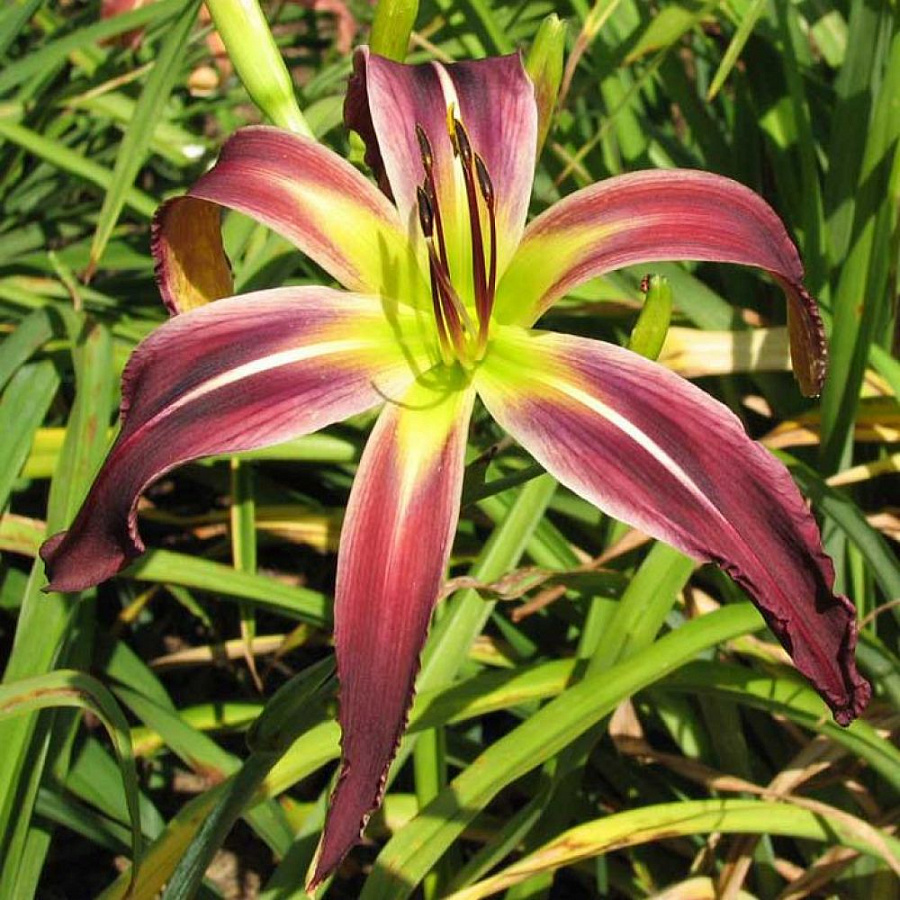 Лилейник гибридный эплике - это великолепное растение, которое поразит вас своей красотой и изяществом. Сорт applique обладает уникальным пурпурно-бордовым цветком с зеленовато-жёлтой звездой в центре, что делает его по-настоящему восхитительным. Этот лилейник достигает высоты до 70 см и цветет в июне и августе, радуя глаз своими яркими лепестками.