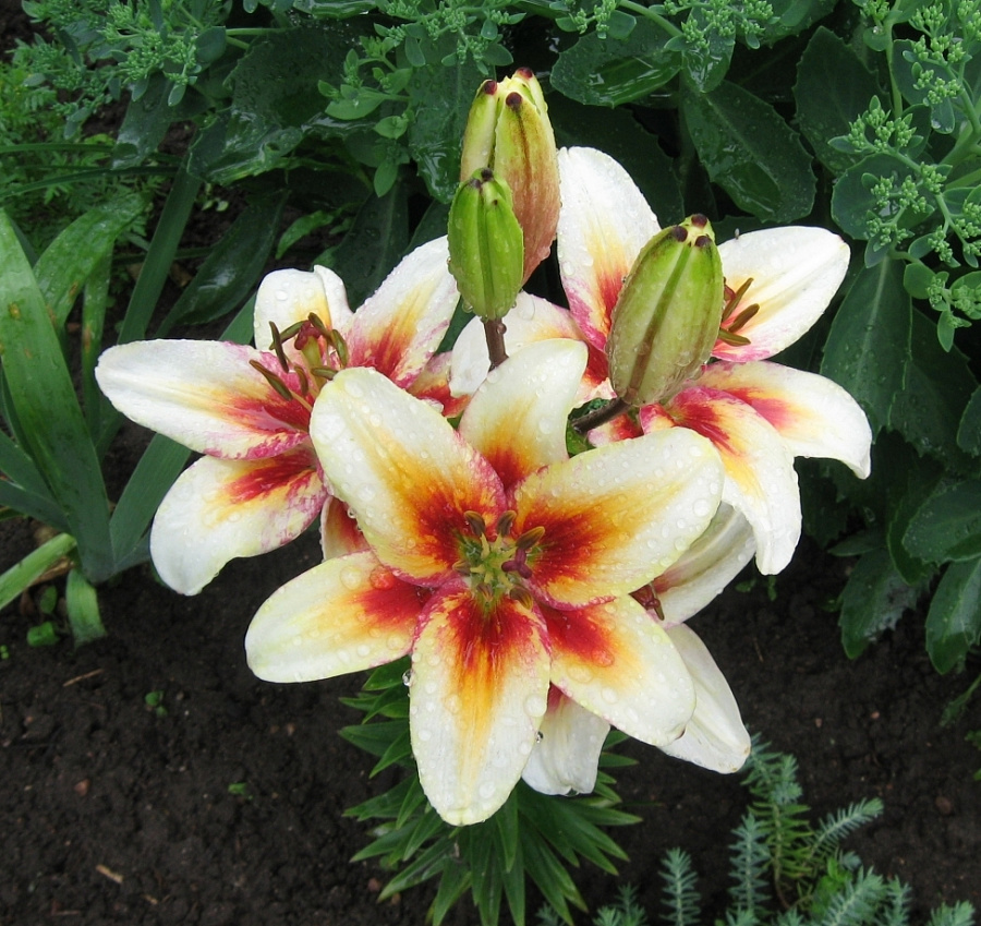 Окраска цветка : Трехцветный сорт. Белый, с малиново-красными мазками поверх желто-оранжевых мазков по центру 2/3 лепестков. Пыльники коричневые.