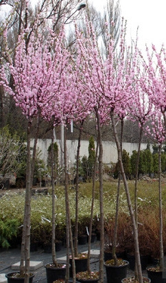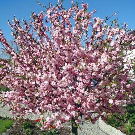 Саженцы Миндаля трехлопастного на штамбе (Prunus triloba) – эффектный кустарник, сменяющий листья каждый сезон. За свою красоту многие называют его японской вишней, но ничего общего, кроме внешнего сходства с сакурой у него нет. Цветы располагаются на побегах, образуют группку из двух бутонов. Лепестки имеют разные оттенки розового цвета. Цветёт этот вид миндаля в апреле-мае. Листья появляются после того, как опадут бутоны. Они плотно облепляют ветви. Миндаль хорошо растёт на солнце и в полутени. Не боится морозов, но первые бутоны могут пострадать от ночных заморозков. Растение подходит как для сада, так и для городского ландшафта.