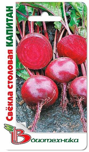 Семена свеклы "Капитан" (Kapitan) принадлежат к сорту, который характеризуется раннеспелостью и корнеплодами, обладающими высокими вкусовыми качествами. От появления первых всходов до начала уборки урожая проходит 60-65 дней. Наилучше культура растет на плодородных и влажных участках. Корнеплоды имеют выровненную, круглую форму с небольшим тонким краешком. Кожица мягкая. Мякоть интенсивно красного цвета, очень сладкая. Овощ богат витаминами, железом, магнием и минералами. Используют урожай для приготовления различных блюд, а также в консервировании.
